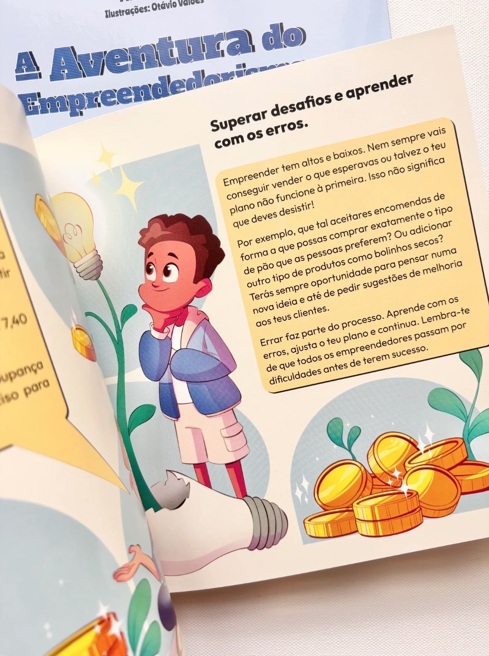Com a ajuda da Ana e do Tomás, as crianças dos 6 aos 12 anos embarcam numa aventura pelo mundo do empreendedorismo. De forma leve e divertida, vão descobrir conceitos básicos de empreendedorismo, ao mesmo tempo que serão incentivadas a usar a sua criatividade e sentido de responsabilidade.